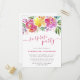 Invitations surprises de fête d'anniversaire avec des fleurs d'aquarelle vibrantes et le feuillage botanique. Surprise partie apparaît dans une police manuscrite rose avec des tourbillons et les détails de la partie sont affichés dans une police serif.