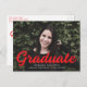 Cartes postales simples et élégantes pour l'invitation à la fête de remise de diplômes avec la photo horizontale du diplômé avec "Graduate" dans un script rouge gras. Personnalisez l'invitation de la fête de remise de diplômes en y ajoutant le nom du diplômé, le nom de l'école et l'année de remise de diplômes. L'invitation inverse pour afficher l'adresse de retour et les détails de la fête de remise.