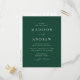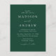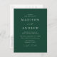 Carte postale minimaliste et moderne avec vos détails mariages en lettres blanches avec accents de script de calligraphie. L'arrière - plan vert forêt peut être changé en une couleur de votre choix. Personnalisez le dos de la carte postale chic faire-part de mariage avec votre adresse de retour, la date de réponse souhaitée, le site Web du mariage et les instructions pour les invités utilisant le modèle texte fourni. Conçu pour coordonner avec notre collection de mariages Modern Elegance.