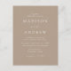 Carte postale minimaliste et moderne avec vos détails mariages en lettres blanches avec accents de script de calligraphie. L'arrière - plan taupe peut être changé en une couleur de votre choix. Personnalisez le dos de la carte postale chic faire-part de mariage avec votre adresse de retour, la date de réponse souhaitée, le site Web du mariage et les instructions pour les invités utilisant le modèle texte fourni. Conçu pour coordonner avec notre collection de mariages Modern Elegance.