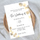 Un arrière - plan blanc décoré de sprigs d'eucalyptus dorés. Personnalisez et votre nom et les détails de la cérémonie. Lettres de couleur noire. Retour : arrière - plan d'or