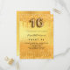 Une invitation moderne, élégante et glamour pour une fête Sweet 16, 16e anniversaire. Un arrière - plan à l'apparence métallique en faux or avec des gouttes de parties scintillant, la peinture goutte à goutte. Le nom est écrit avec un script de style moderne écrit à la main. Personnalisez et ajoutez les détails de votre fête. Le numéro 16 est écrit avec une police de style ballon, script. Conseil : Si vous ne voulez pas qu'il ressemble à une carte postale, cliquez sur customiser, allez à l'arrière et retirez le séparateur et le timbre postal.
