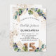 Pour une Quinceañera, fête du 15e anniversaire. Un arrière - plan blanc décoré de verdure d'eucalyptus et de feuilles dorés. Taches de fausse parties scintillant dorée. Personnalisez et ajoutez vos noms et les détails du mariage. Lettres noires et dorées. Le numéro 15 est écrit avec une police de style ballon. Dos : taches d'arrière - plan blanc et de faux parties scintillant doré, design de carte postale. Conseil : Si vous ne voulez pas qu'il ressemble à une carte postale, cliquez sur customiser, allez à l'arrière et retirez le séparateur et le timbre postal.