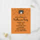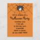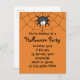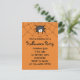 Invitations de la fête d'Halloween en orange et noir. Modèles pour ajouter tous vos détails. En haut et à l'arrière se trouve une mignonne araignée de dessins animés noirs avec de grands yeux rigolos et de petits crocs blancs, assis sur sa toile.