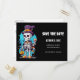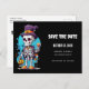 Enregistrez la carte postale date avec une illustration d'un squelette humoristique. Portant un chapeau haut, tenant un verre. Il a un grand sourire sur le visage. Amusement sympa et éffrayant pour Halloween.