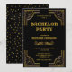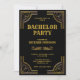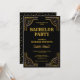 Invitez vos invités avec cette invitation de fête de bachelor sur le thème vintage Gatsby le Magnifique avec une bordure décorative dorée et une typographie élégante sur fond noir. Ajoutez simplement les détails de votre événement sur ce modèle facile à utiliser pour en faire une invitation unique. Retournez la carte pour révéler un beau motif de triangles dorés au verso de la carte.