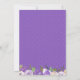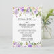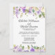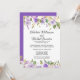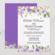 Des fleurs violettes foncées, des roses violettes claires et des fleurs blanches ivoire sont nichées dans une variété de feuilles et de branches. Elles créent une jolie bordure florale le long du haut et du bas de ce carton d'invitation de réception de mariage intime. Le dos de l'invitation est violet royal avec de très petits points blancs. La bordure florale continue le long du bas.