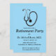 Cette carte d'invitation modifiable présente un stéthoscope sur fond bleu. Ci-dessous se trouvent les détails modifiables de l'événement. Cette carte est présentée pour la retraite d'un médecin, mais elle peut également être utilisée pour toute raison de célébration (diplôme, nouvel emploi, promotion, retraite) pour toute profession médicale.
