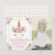 Cartes d'invitation de fête d'anniversaire licorne avec une douce licorne rose et or avec des cils dorés et une corne florale sur un beau fond floral rose et or. Cette douce invitation d'anniversaire licorne est facilement personnalisable pour votre événement en ajoutant simplement votre photo et vos coordonnées. Vous pouvez également changer la couleur de fond de cette adorable invitation licorne. Il s'agit d'un design imprimé sans véritable pailletage.