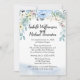 De beaux cartons d'invitation de réception de mariage intime à motif floral bleu, élégants mais très modernes. Les dessins à l'aquarelle sont un choix très populaire cette année. Ce carton d'invitation combine des fleurs à l'aquarelle sur la bordure supérieure et un lavis d'aquarelle bleu clair sur le bord inférieur. Une grande fleur bleue est centrée sur la bordure supérieure. Des fleurs crème jaune et rose clair plus petites sont nichées dans la verdure.