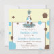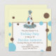 Un invitation de fête d'anniversaire avec des pois bleus et marrons de différentes tailles et un casquette de fête assorti au sommet. Personnalisez le texte avec les détails de votre occasion.
