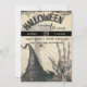 Une version vieillotte d'un classique Costumes et Cocktails Halloween sur invitation personnalisée. Doté d'un casquette de sorcière sombre en bas à gauche et d'un éffrayant fantôme comme une main squelette en bas à droite. La main squelette est recouverte d'un bijou victorien. Dans l'arrière - plan trouver une toile d'araignée et une croix celtique. Customisez l'avant de cette invitation à la fête des Costumes et Cocktails d'Halloween avec tous vos détails. Le verso de cette invitation présente la même illustration.