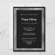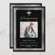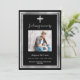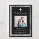 Un enterrement/célébration simple, élégant, moderne et élégant de l'invitation à vivre. Un arrière - plan noir classique décoré d'une fausse croix d'argent et de faux cadres d'argent. Personnalisez et ajoutez un nom photo et des détails. Texte blanc.