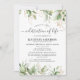 L'invitation personnalisée pour le service funéraire est un moyen idéal d'honorer le défunt et de célébrer sa vie de manière respectueuse et digne. Avec des feuilles de eucalyptus botaniques vertes à l'aquarelle élégantes, des accents floraux dorés et un modèle de célébration de la vie facile à personnaliser.