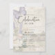 Elegant "Celebration of Life" Invitation featuring a serene vintage background of handwritten letters, a soft watercolor bridge scene, and delicate floral details with lavender sprigs, ivory peonies, and a graceful purple butterfly.