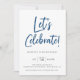 Scénario moderne Fêtons !, invitation d'anniversaire. Modèle de style design de typographie bleu marine et noir. Le dos de la carte comporte un motif de sunburst rétro cool en coordonnant les couleurs bleues.