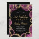 Elégante Parties scintillant moderne rose et or Cercles d'encre Black 21st Birthday Invitation. Cette fille féminine adulte vingt et un (ou tout âge) invitation à la fête d'anniversaire comporte un élégant script de calligraphie écrit à la main et des Cercles d'encre d'alcool rose et or encadré sur arrière - plan noir. Idéal pour une fête d'anniversaire féminine pour adultes, cette invitation saisit parfaitement l'essence d'une fête d'anniversaire moderne en or et en parties scintillant rose.