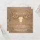Faire-part de mariage rustique du sud-ouest avec plumes et vigne fleurie drapé crâne de cerf sur un arrière - plan de bois rustique. Ce magnifique faire-part de mariage de crâne de cerf orné rustique est facilement customisé pour votre événement en ajoutant simplement vos détails dans le style de police, la couleur et le libellé de votre choix.