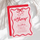 Cette invitation baby shower "Elle est la cerise sur le dessus" à la mode, rétro et moderne présente un arrière - plan rose avec un arc dessiné à la main et un cadre ondulé en rouge. L'envers comporte un arrière - plan rouge.