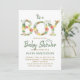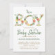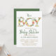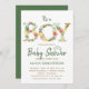Printemps ou été c'est un garçon de fleurs colorées typographie bébé garçon invitation dans la palette de couleurs pastel de corail rouge, rose rousse, jaune et vert chasseur. — Convient à l'extérieur, jardin, fêtes de jardin ou barbecue.