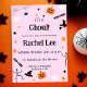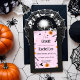 Un baby shower d'Halloween simple et sophistiqué invitation pour les petites filles. De mignons fantômes, citrouilles, chauves-souris, bonbons, sorcières casquettes, squelettes, et regarder un livre entourent la typographie éffrayante sur un arrière - plan rose. Parfait pour les baby showers d'automne et d'Halloween avec des couleurs orange, violet, noir et blanc.