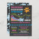 Fille Chalkboard Waterslide Pool invitation fête d'anniversaire avec un toboggan gonflable coloré, éclaboussures d'eau, un soleil heureux et une typographie amusante.