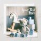 Une chambre pour enfants confortable et charmante avec un ours en peluche gris et doux, un cheval à bascule blanc et bleu et plusieurs blocs de bâtiment bleus et blancs. La salle est décorée dans une palette apaisante de tons bleu et blanc, offrant une atmosphère calme et accueillante pour jouer et se détendre