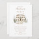 An elegant Christmas invitation featuring a grand festive manor surrounded by snowy evergreens, designed in warm champagne and taupe tones. The soft watercolor style and neutral palette create a timeless, sophisticated holiday aesthetic — perfect for formal gatherings or cozy family celebrations.