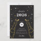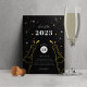 Passez la bulle ! Les invitations à la fête du Nouvel An sont accompagnées de deux illustrations de bouteilles de champagne sur un arrière - plan noir orné d'étoiles dorées et blanches.