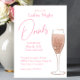 Cette invitation personnalisée propose un thème glamour pour le Cocktail Dames de nuit. Les informations de la fête sont imprimées dans une police rose pâle, avec le titre "Boissons" imprimé dans un script élégant. Un verre de champagne rose pétillant est placé sur la droite. Les confettis de parties scintillant rose accentuent la partie inférieure.
