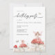 Invitation d'anniversaire avec un cadre voûté de champignons aquarelles. Customisez avec vos informations. Cliquez sur "cliquer pour customiser plus loin" pour modifier le style, la taille ou la couleur de la police.