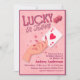 Célébrez l'amour, la chance et les fins heureuses avec cette charmante invitation de fête prénuptiale « Lucky in Love ». Dotée d'une palette rose doux, d'éléments ludiques inspirés des casinos et d'une typographie élégante, cette conception est parfaite pour un thème de fête prénuptiale amusant et classe. La main illustrée tenant une carte reine de cœur ajoute une touche romantique et élégante qui lie magnifiquement le thème.