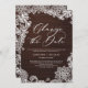 Changez la date ! Annoncez à votre famille et à vos amis le report de votre mariage avec cette carte d'annonce de mariage rustique. Elle présente une broderie antique florale et de feuillage sur un fond en faux bois avec un motif de dentelle assorti. Personnalisez en ajoutant vos noms et d'autres détails. Cette carte d'annulation de mariage à la dentelle florale sera également parfaite comme annonce d'élopement.