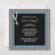 Invitation pour la première communion d'un garçon avec un chapelet et des rayures bleues noires et blanches.