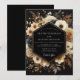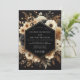 This elegant design features a dramatic floral arrangement against a deep charcoal backdrop. A lush bouquet of cream, beige, and dusty blue anemones and dahlias creates a moody, romantic atmosphere. Delicate gold-toned foliage adds a touch of warmth and sophistication for a memorable union.