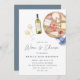 Invités Invitations pour une fête du vin et du fromage avec ces invitations décontractées chic. Le design présente des illustrations d'aquarelle d'une planche de charcuterie remplie de fromage, de viande et de fruits, accompagnée d'une bouteille de vin blanc et de deux verres. Personnalisez la bouteille de vin avec une initiale pour une touche spéciale, et ajoutez les détails de votre fête en dessous. Customisez pour n'importe quelle occasion, comme les anniversaires, les départs à la retraite ou les ménagères.