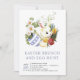 Aquarelle moderne Invitation au brunch de Pâques et à la chasse aux oeufs mettant en vedette le lapin de Pâques dans un arrangement floral de printemps aquarelle, un poulet et des oeufs.