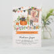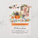 Une invitation citrouille-orientée adorable de fête d'anniversaire pour une fête d'anniversaire de fête d'anniversaire d'octobre ou de Halloween, avec un chat noir se reposant à l'intérieur d'un citrouille avec le dessus du citrouille comme casquette. Ajoutez une photo de votre enfant à l'intérieur d'un cadre orange sous les drapeaux colorés d'étamine et à côté d'illustration tirée par la main avec des citrouilles, des roses, et le feuille d'automne. L'arrière - plan comporte une texture faible et pâle de bouleau.