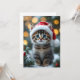 Ce design affectueux montre un adorable chaton aux yeux bleus brillants, portant un bonnet de Noël rouge et entouré de reflets lumineux chauds. L'arrière-plan flou avec des lumières et des détails hivernaux crée une atmosphère de Noël particulièrement confortable et chaleureuse.