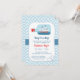 Une invitation au baby shower à thème nautique pour maman d'être qui attend un bébé garçon ! Il dispose d'un bateau qui vole en bouteille. Un arrière - plan de motif zigzag de chevron bleu et blanc. Palette de couleur rouge, bleu et blanc. Personnalisez facilement avec les détails de la fête.