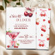 An elegant modern design featuring a watercolor illustration of a cherry martini tied with a pink bow and a cute cherry pattern on the back. Customize the details for a unique and chic Birthday Celebration.