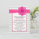 Une élégante invitation à la douche nuptiale faite en arrière - plan par un motif de zigzag de chevron gris clair et blanc. Au centre, une zone de texte blanche aux bords roses est décorée au sommet d'un ruban rose vif et d'une jolie fleur. Le texte en rose et en gris est prêt à être personnalisé pour votre événement de mariage. Joliment inviter la mariée à être chérit.