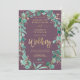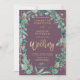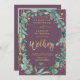Elégant feuille eucalyptus or script photo mariage avec cadre de terrarium géométrique or, fausse parties scintillant de confettis or, et vert peint eucalyptus vert vert vert aquarelle sur aubergine violet foncé. Ajoutez votre photo à l'arrière.