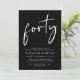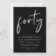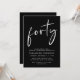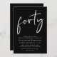 Invitation noire chic pour votre fête de 40e anniversaire avec "quarante" dans un script blanc élégant, votre nom en élégante typographie serif blanche, et les détails de la fête en lettres blanches simples et modernes.