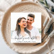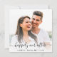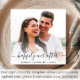 Faire-part de mariage bleu poussiéreux moderne avec votre invitation dans une élégante typographie blanche sur un côté et votre photo superposée avec "Happily Ever After" dans un script chic avec des swashes et vos prénoms et votre date mariage réunis avec un coeur de l'autre côté.