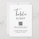 Symbole de numéro de table de réception de mariage avec "Table" dans un script moderne design, le numéro de table dans une typographie moderne simple, vos noms unis par un coeur, votre date de réception, et un code QR lié à votre site Web pour les invités à scanner pour télécharger des photos ou pour d'autres raisons.