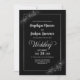 Invitation vos amis et proches à votre mariage pour assister et célébrer le début de votre voyage de toute votre vie avec cette invitation noire moderne. Le texte personnalisable vous permet d'ajouter vos noms, votre date de mariage et les détails nécessaires de votre célébration. Conçu pour le couple à faible budget, l'emplacement du lieu de réception, la demande de réponse RSVP, les détails de l'hébergement et toute autre information dont vos invités pourraient avoir besoin peuvent être inclus au verso de l'invitation, ce qui permet d'économiser de l'argent sur des articles de papeterie supplémentaires. Célébrez votre histoire d'amour comme jamais auparavant avec cette faire-part de mariage. Une variété de types de papier et de styles d'angle sont disponibles pour vos invitations uniques, ainsi que l'option de téléchargement.