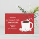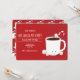 Une invitation de vacances horizontales pour une fête de Noël Hot Chocolat. Cette invitation comprend une tasse souriante de cacao chaud avec un sucre de canne et plusieurs guimauves joyeuses. Tous les mots peuvent être customisés.