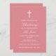 Blush Pink Traditional Christening Invitation, s'il vous plaît personnaliser comme souhaité, en utilisant le modèle de personnalisation en ligne avant de commander. L'invitation présente à la fois la croix et le texte élégant et élégant sur un bel arrière - plan rose vif.