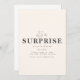 Ce modèle d'invitation à une fête surprise se vante d'un fond beige chaud qui donne un ton subtil et élégant à l'événement. Les mots "C'est une surprise !" sont affichés bien en vue dans une police de caractères script ludique, ajoutant un sentiment d'excitation et d'anticipation à l'invitation. Sous ce titre animé, il y a une zone désignée pour les détails de la fête, y compris la date, l'heure, le lieu et les instructions spéciales pour garder la surprise intacte. La conception globale trouve un équilibre parfait entre amusement et sophistication, ce qui en fait un choix idéal pour toute célébration surprise.